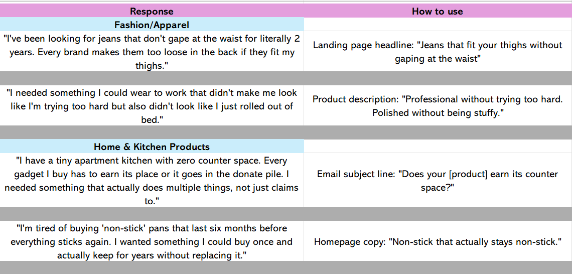 Read previous newsletters Hello Reader, This is my final survey-related newsletter. I'll share survey questions tweaked by industry, and show you how to use the responses to understand and communicate pain points, desires, and motivations in your content/copy. If you're pressed for time, here's a quick refresher: If you're E-commerce: Start with one question on order confirmation page: "What made you choose this product today?" If you're SaaS: Email users on day 3: "What problem were you...